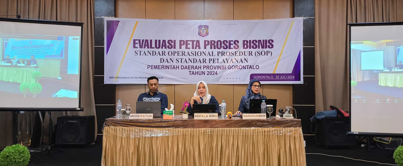 Kepala Biro Organisasi Setda Provinsi Gorontalo Sri Wahyuni D. Matona, S.STP, M.Si membuka kegiatan Evaluasi Peta Proses Bisnis Standar Operasional Prosedur (SOP) dan Standar Pelayanan, Kamis (25/7) di Manna Hall.
