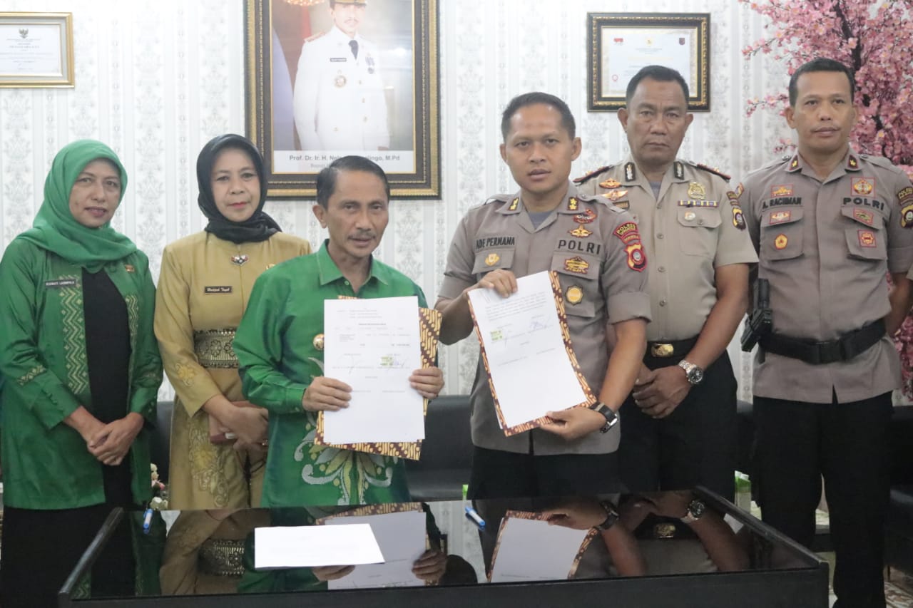 LIGO.ID – Bupati Gorontalo Nelson Pomalingo menandatangani Naskah Perjanjian Hibah Daerah (NPHD) bersama Kapolres Gorontalo AKBP Ade Permana di ruang Kerja Bupati Gorontalo, Kamis (5/3).