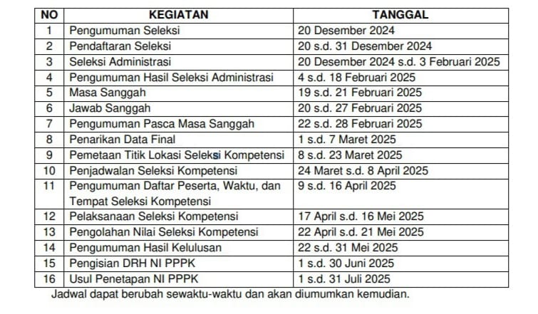 Jadwal pelaksanaan seleksi berdasarkan surat Plt. Kepala Badan Kepegawaian Negara Nomor 6610/BKS.04.01/SD/K/2024 tanggal 27 September 2024 ditetapkan sebagai berikut :