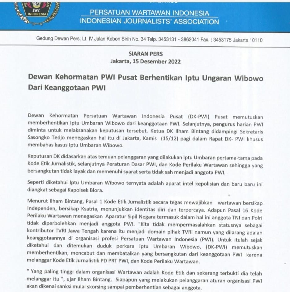 “Kita tidak mempermasalahkan statusnya sebagai kontributor TVRI Jawa Tengah karena itu menjadi domain pihak TVRI namun yang dilarang adalah keanggotaannya di organisasi profesi Persatuan Wartawan Indonesia (PWI). Untuk itulah sejak diketahui dan ditemukan duduk perkara Iptu Umbaran Wibowo, DK PWI memutuskan memberhentikan, mencabut dan membatalkan yang bersangkutan dari keanggotaan PWI karena melanggar Kode Etik Jurnalistik PD PRT PWI, dan Kode Perilaku Wartawan” ungkap Ilham Bintang.
