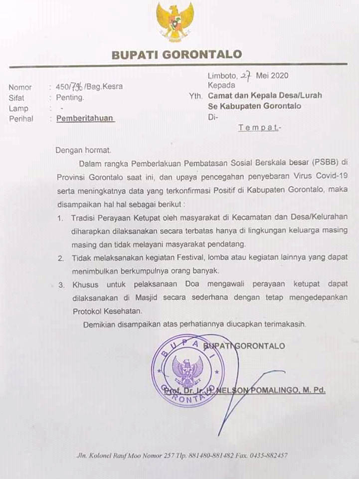Dalam surat yang ditandatangani langsung oleh Bupati Gorontalo, Nelson Pomalingo pada Rabu 27 Mei 2020 tersebut berisikan tentang Aturan Pelaksanaan Perayaan Ketupat di setiap Desa dan Kelurahan, sebagai upaya pencegahan penyebaran Covid-19.