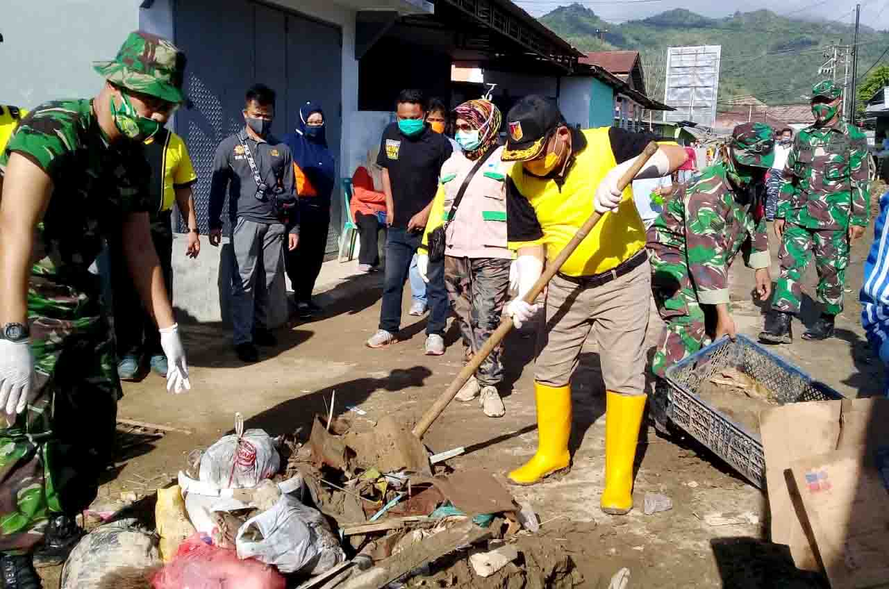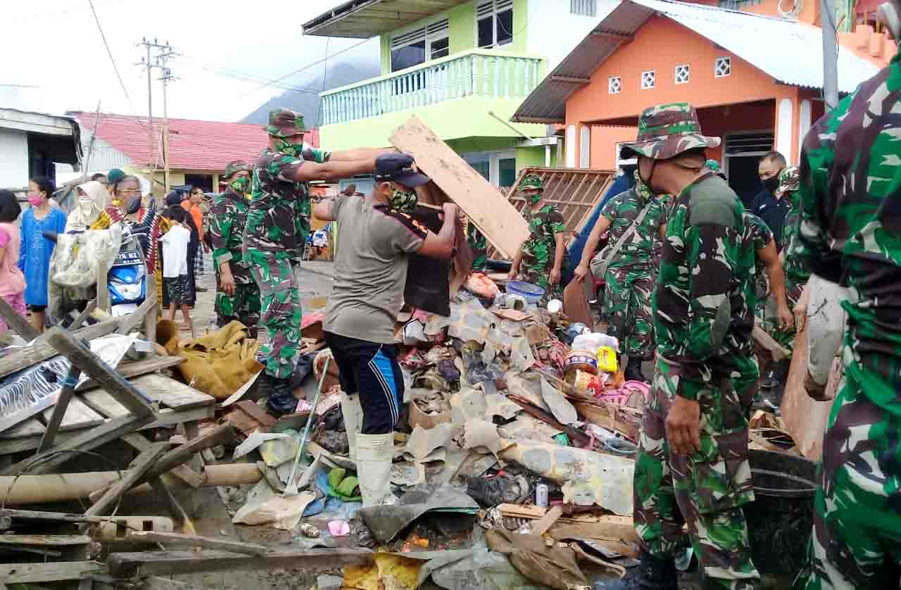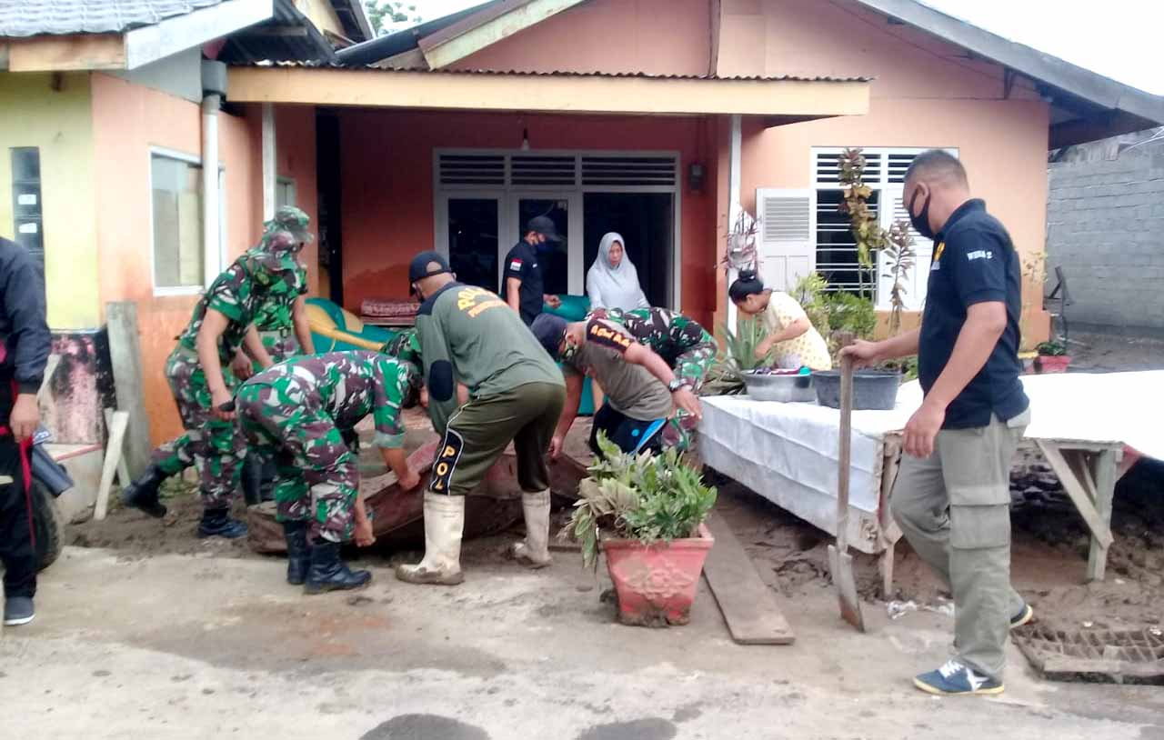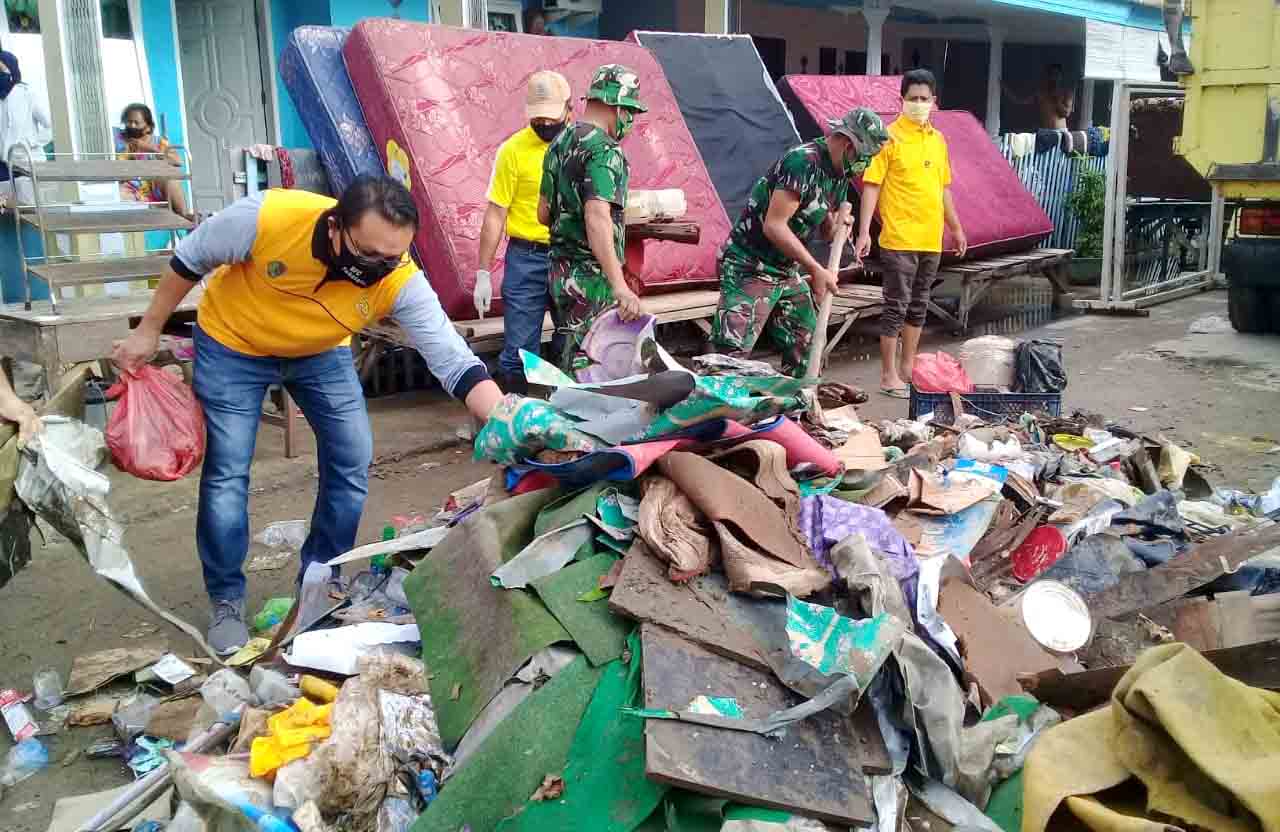 Warga terdampak banjir dibantu TNI dan Satpol PP berusaha memindahkan perabot Rumah Tangga yang rusak akibat lumpur yang terbawa banjir.