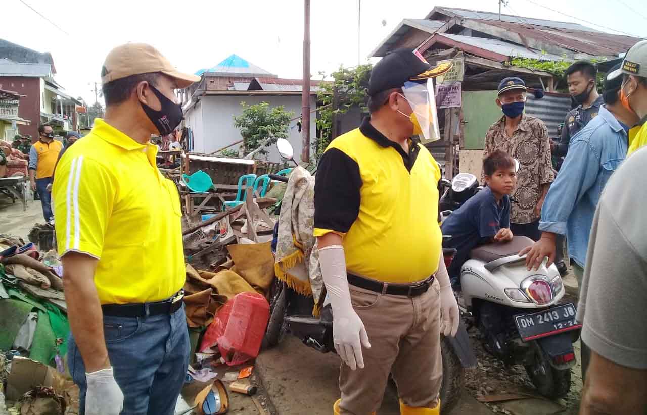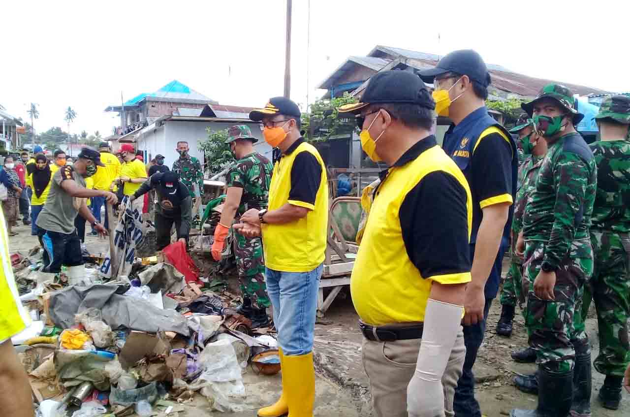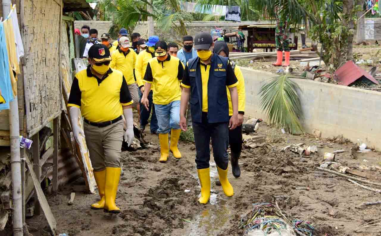 Bersama Wawali Ryan Kono, Walikota Marten Taha menyusuri pemukiman warga yang tidak terjangkau akses kendaraan dan masih penuh lumpur banjir.