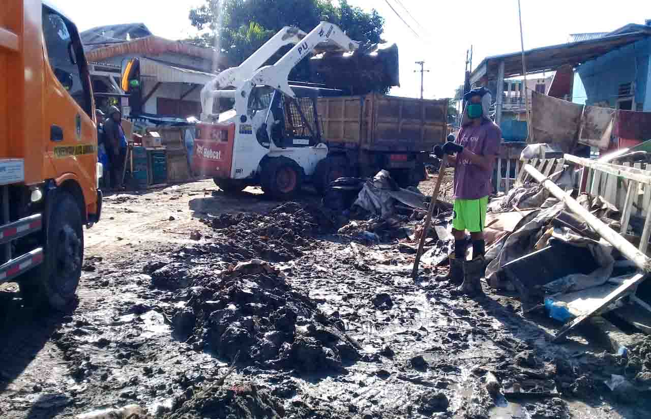 Beberapa alat berat dan truk-truk sampah milik pemda kota Gorontalo difokuskan untuk mengangkut lumpur yang terbawa arus banjir yang menutupi jalan-jalan dan rumah warga.