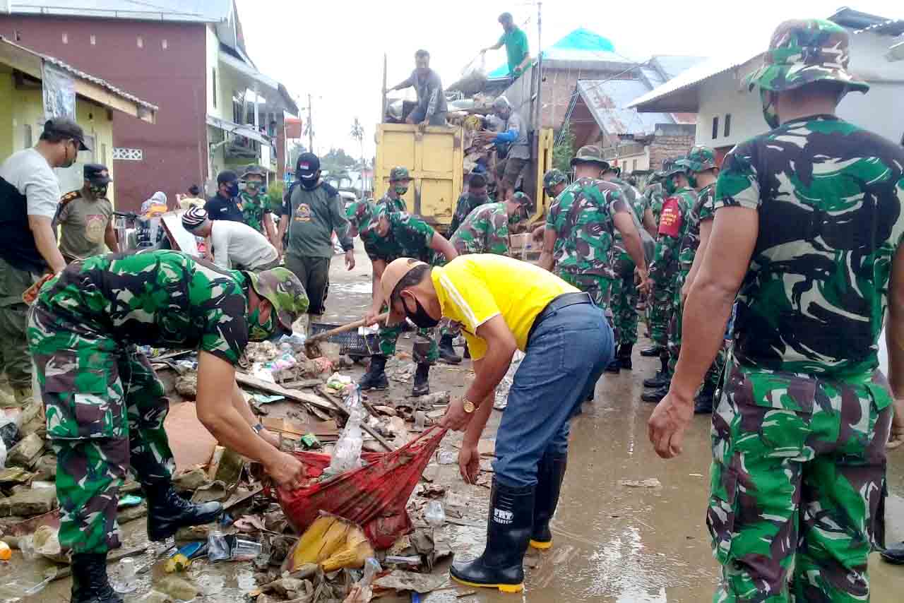 Satpol PP Kota Gorontalo diturunkan bersama TNI mengangkut puing bencana luapan Sungai Bone yang masih berserakan di ruas-ruas jalan kelurahan Bugis.