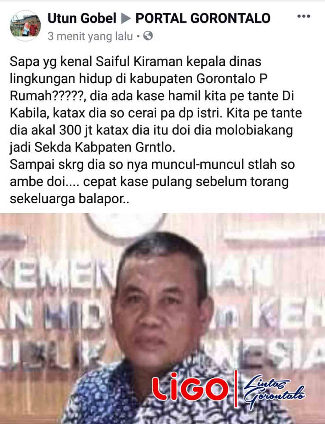 “Sapa yang kenal Syaiful Kiraman, Kepala Dinas Lingkungan Hidup Kabupaten Gorontalo??? Dia ada kase hamil Kita P Tante di Kabila, katanya dia so cerai pa dp Istri. Kita pe Tante dia akal 300 Jt, katanya itu doi (baca :uang) dia molobi akang jadi Sekda Kabupaten Gorontalo,” tulis Akun Utun Gobel dalam Akun Facebook Portal Gorontalo sambil men-‘tag’ foto Syaiful Kiraman. Kamis (03/01).