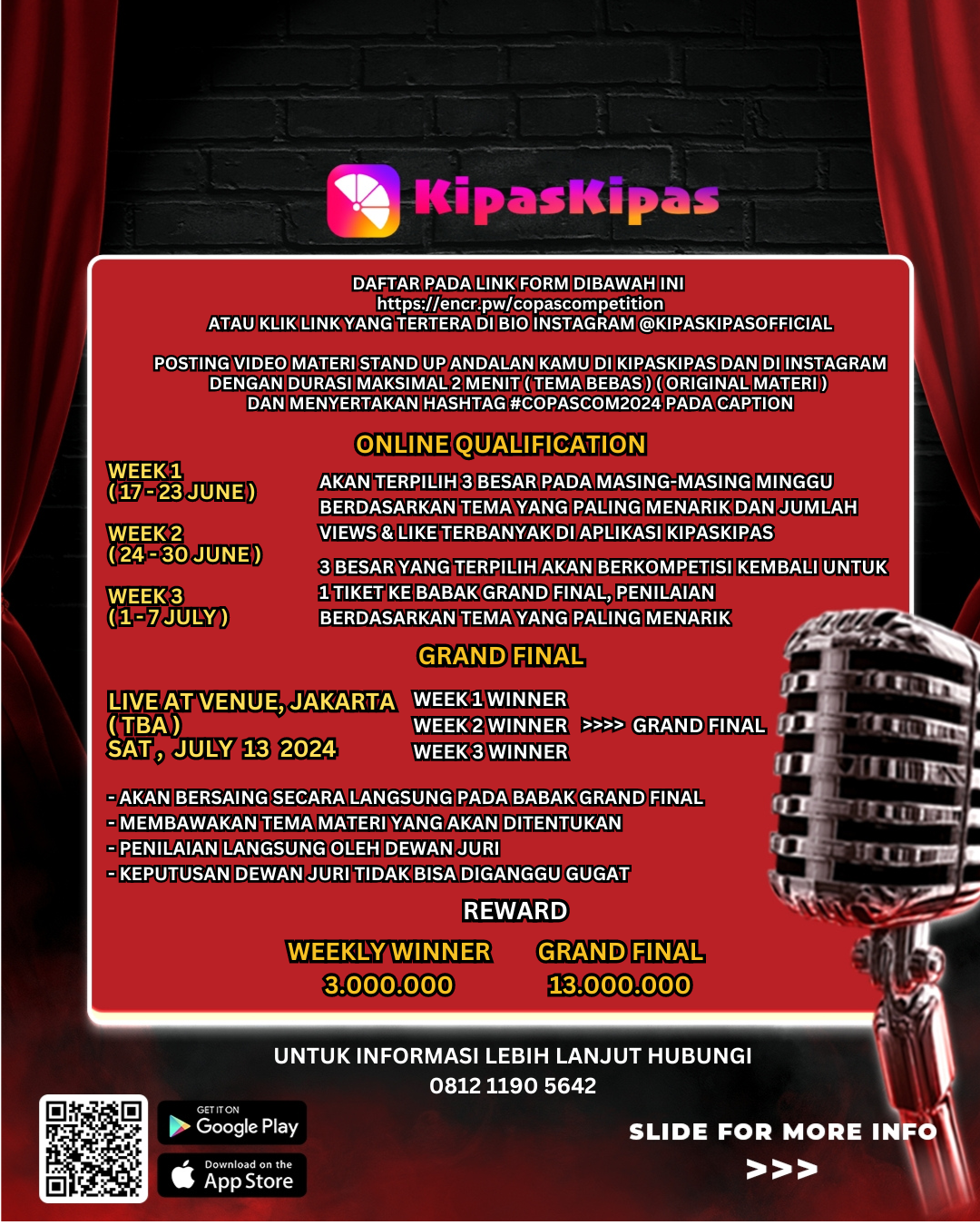 Mari bersama-sama mencari bakat tersembunyi dan tertawa untuk merayakan seni komedi yang penuh canda tawa. Siapkan materi terbaik anda, untuk menghibur dan membuat seluruh orang terbahak-bahak. Kunjungi Official Instagram @kipaskipasofficial untuk informasi lebih lanjut.