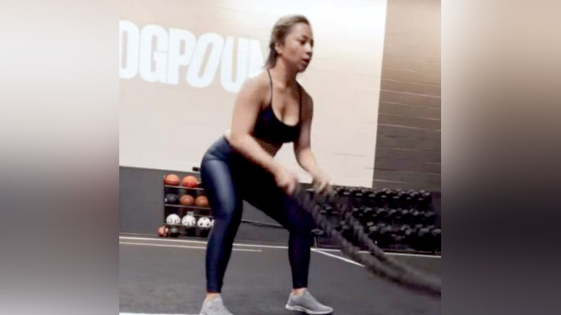 Tidak cuma angkat barbel, istri Indra Priawan juga melakukan battle ropes. Kecepatan tangan Nikita saat menggerakkan tali tebal dan berat sangat mengagumkan.
