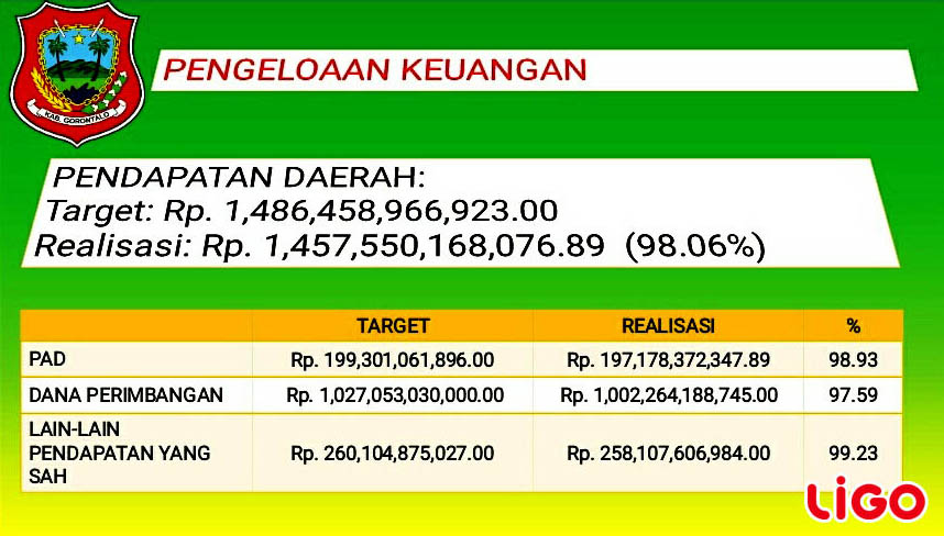 “Sementara untuk Pengelolaan Keuangan Daerah, Pemerintah menargetkan Rp. 1.486.458.966.923.00, Pendapatan Daerah dan yang berhasil direalisasikan sebesar Rp. 1.457.550.168.076.89 (98.06 %),” papar Nelson.