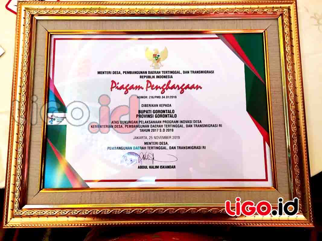 Bupati Gorontalo Nelson Pomalingo terpilih menjadi salah satu bupati terbaik di Indonesia, karena berhasil mendorong inovasi desa. Penghargaan bergengsi ini diterima Sekretaris Daerah Kabupaten Gorontalo Hadijah U Tayeb langsung dari Menteri Desa PDT dan Transmigrasi, Abdul Halim Iskandar, Senin (25/11).