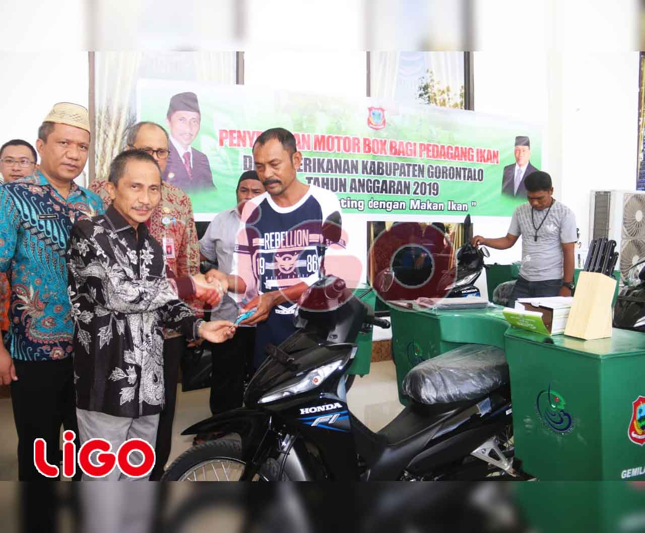 LINTAS LIMBOTO (LIGO) – Dorong peningkatan ekonomi Penjual Ikan Keliling, Bupati Kabupaten Gorontalo Nelson Pomalingo berikan Bantuan Motor ber-Coolbox kepada 10 Orang Penjual Ikan Keliling yang sebelumnya menjual ikan hanya dengan menggunakan Sepeda.
