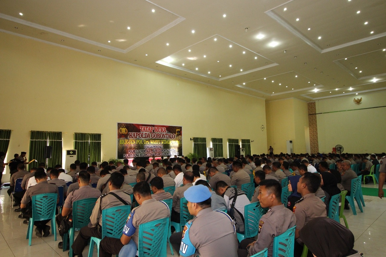 Hal ini dikatakan oleh Kapolda Gorontalo,Brigjen.Pol.Drs Wahyu Widada saat bertatap muka bersama personil Polres se-Propinsi Gorontalo pada hari Kamis (06/02) yang dibagi menjadi dua tempat kegiatan yakni di Hotel Grand Amalia Boalemo pukul 09.00 wita yang diikuti oleh personel Polres Pohuwato dan Polres Boalemo, selanjutnya pada pukul 13.30 Wita di Gedung Kasmat Lahay Gorontalo diikuti oleh personel Polres Gorontalo Kota, Polres Gorontalo, Polres Boalemo dan Polres Bone Bolango.