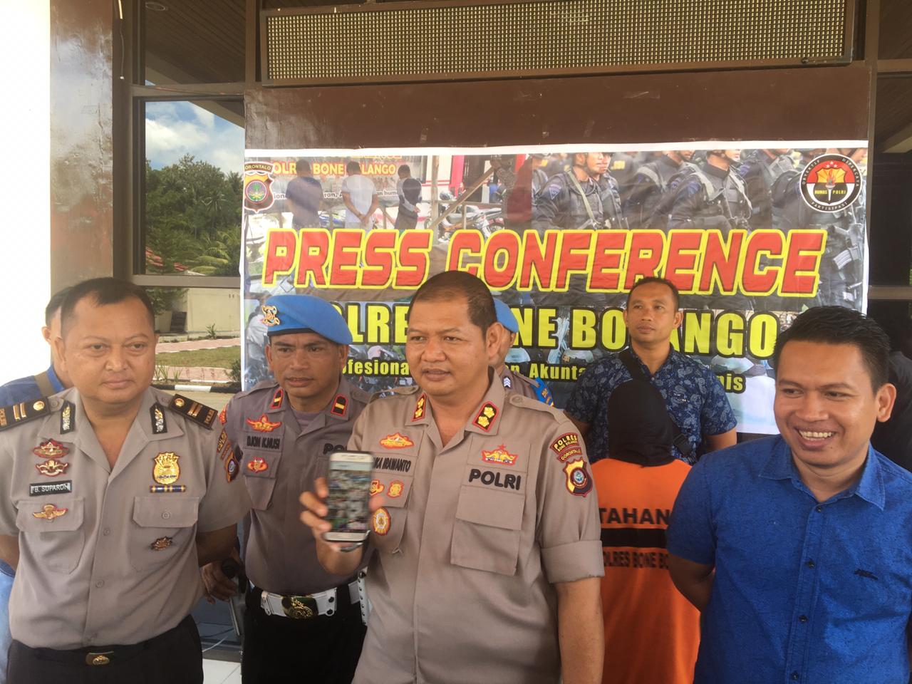“Pelaku ini menggunakan sebanyak enam akun palsu Facebook dengan foto profil orang lain untuk memancing korban untuk masuk ke perangkapnya,” Kata AKBP Irawanto di Mapolres Bone Bolango, Rabu (11/3).