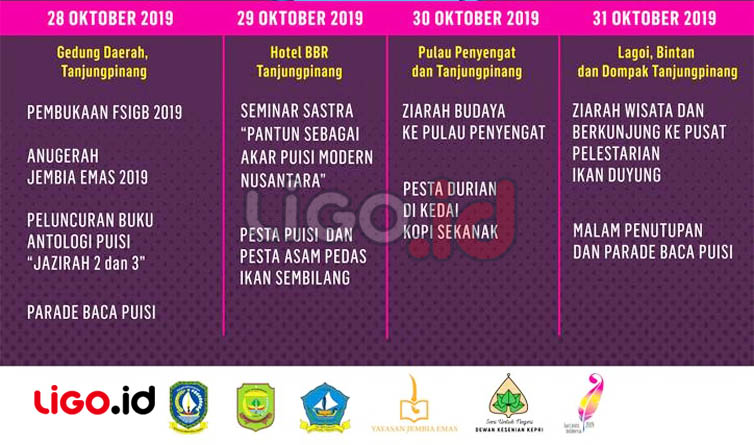 TANJUNGPINANG (LIGO.id) – Ratusan Penyair dari Dalam Negeri dan Negara Tetangga khususnya Asia Tenggara bakal menghadiri Festival Sastra Internasional Gunung Bintan (FSIGB) 2019. Festival ini akan digelar mulai 28 Oktober hingga 1 November 2019 mendatang.