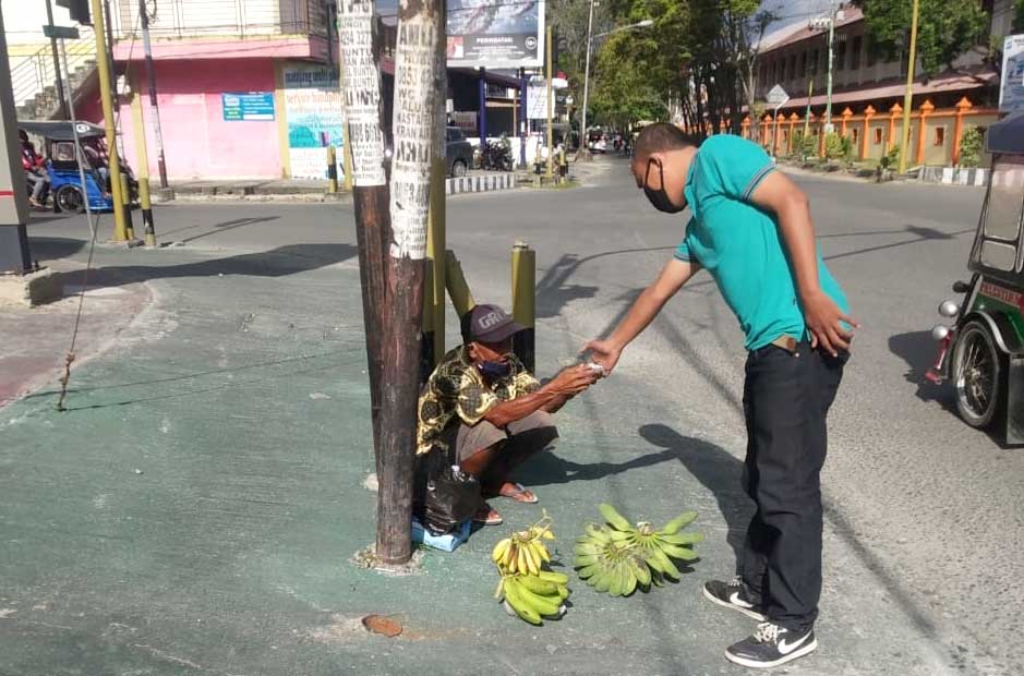 Selain berbagi dengan Oma Hana di Padebuolo, Komunitas Basket Touring Gorontalo juga menyambangi seorang Kakek renta yang biasa berjualan pisang di sudut jalan simpang empat SMP 6 kota Gorontalo.