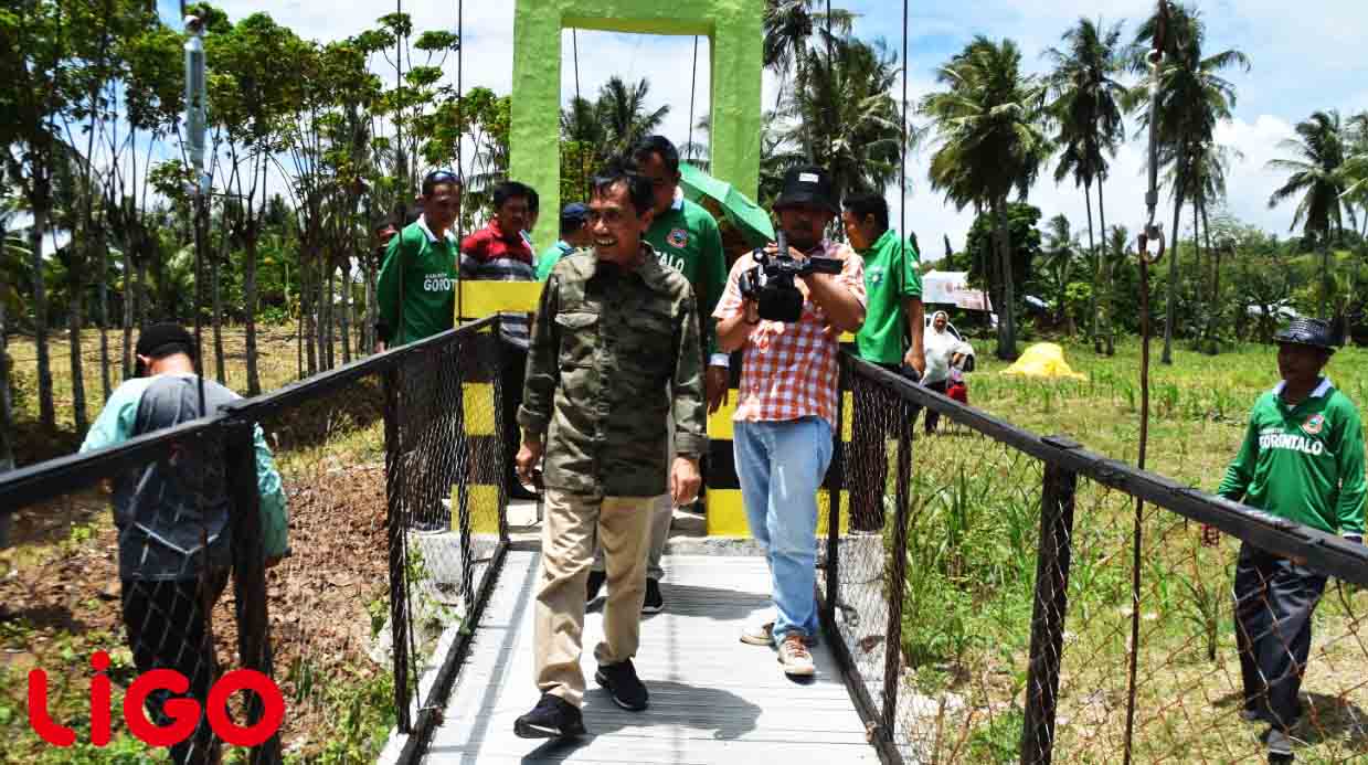 LINTAS KABGOR (LIGO) – Bupati Gorontalo Prof. Nelson Pomalingo yang didampingi Sekda Hadijah Tayeb dan Pimpinan OPD meresmikan Infrastuktur Jalan Dusun Perintis di Desa Iloponu sepanjang 717 meter, dilanjutkan Jembatan Gantung Desa Buhu dengan panjang 50 meter, kemudian Jalan Desa Buhu – Olobua dengan panjang 3,5 Km dan Jembatan 7 meter. Ahad (10/3) saat blusukan ke Kecamatan Tibawa.