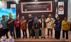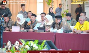Serentak terdengar ucapan selamat datang Kepada Bapak Dr. Gunawan Suswantoro, Sekretaris Jenderal Bawaslu Republik Indonesia di Kantor Bawaslu Kabupaten Gorontalo yang ditandai dengan pengalungan syal dan peci khas gorontalo diiringi adat longgo.