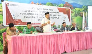 Setelah Launching Jaga Pemilu Dr. Gunawan Suswantoro menerima kaus bertuliskan Jaga Pemilu yang di serahkan langsung Anggota Bawaslu Kabupaten Gorontalo Alexander Kaaba,ST.