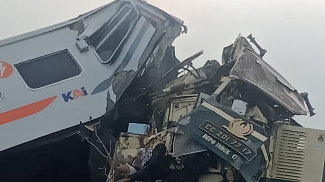 Menurut informasi yang berhasil dihimpun Suara.com, sebanyak 3 gerbong kereta api lokal Bandung Raya anjlok akibat peristiwa adu banteng tersebut.